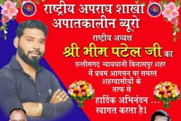 बिलासपुर। रास्ट्रीय अपराध शाखा आपातकालीन रास्ट्रीय अध्यक्ष का प्रथम नगर आगमन गुरुवार को होगा। 4 फरवरी को 4 बजे रास्ट्रीय अध्यक्ष श्री भीम पटेल जी के आगमन पर बिलासपुर नगर में स्वागत सभा का आयोजन रखा गया है। श्री पटेल जी गुरुवार को दिल्ली से बिलासपुर के चकरभाटा एयरपोर्ट पर विमान द्वारा शाम 4 बजे प्रस्थान करेंगे, जहां उनका कार्यकर्ताओं के द्वारा स्वागत समारोह किया जाएगा, फिर वहां से बिलासपुर के लिए प्रस्थान करेंगे और बिलासपुर में भी उनका स्वागत समारोह का आयोजन रखा गया है।