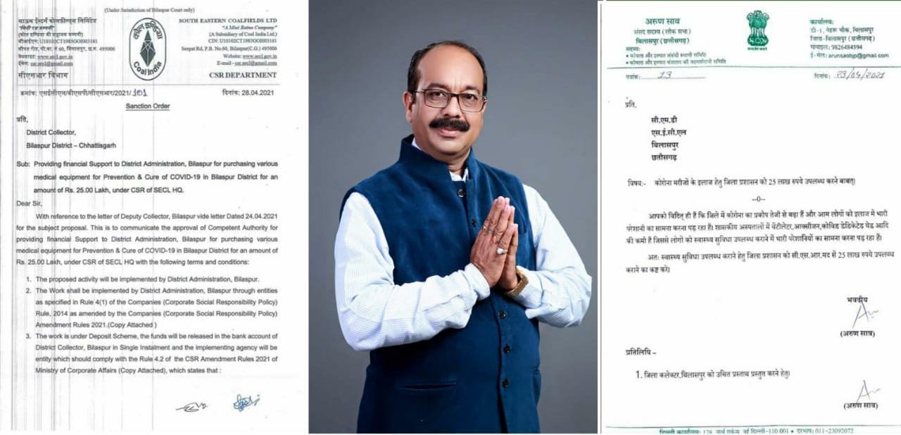 बिलासपुर। सांसद अरूण साव ने कोरोना महामारी को देखते हुए स्वास्थ्य सुविधाओं में विस्तार हेतु जिला प्रशासन के लिए एस.ई.सी.एल से 25 लाख रूपये की मांग की थी जिसे एस.ई.सी.एल ने पूरी कर दी । सांसद अरूण साव ने एस.ई.सी.एल. के सी.एम.डी. को पत्र लिखा था कि वर्तमान में जिले में कोरोना का प्रकोप लगातार बढ रहा है। जिले के शासकीय अस्पतालों में वेंटिलेटर ऑक्सीजन कोविड डेडिकेटड बेड आदि की कमी के कारण लोगों को स्वास्थ्य सुविधा उपलब्ध कराने में भारी परेशानियों का सामना करना पड रहा है।