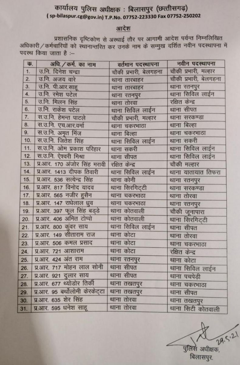 बिलासपुर पुलिस एसपी ने एक बार फिर अधिकारियों/कर्मचारियों का ट्रांसफर लिस्ट जारी किया लिस्ट जारी करने से पहले कप्तान ने सारे पुलिस कर्मियों से आवेदन मंगा कर तीन विकल्प मांगे थे, जिसकी प्रक्रिया पूर्ण होने पर 6 SI, 6 ASI व 19 प्रधान आरक्षकों को इधर से उधर किया गया पुलिस अधीक्षक के अनुसार यह लिस्ट पहले ही निकलने वाली थी,