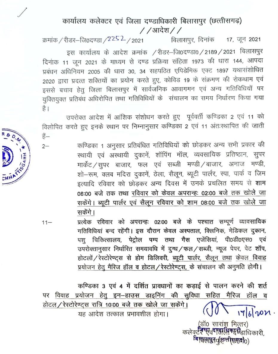 बिलासपुर। कोरोना के लगातार कम होते मामले को देखते हुए एक बार फिर से पूरे देश में अनलॉक की प्रक्रिया शुरू हो गई है.. छत्तीसगढ़ की राजधानी समेत न्यायधानी बिलासपुर में भी रविवार को लगे पूर्ण लॉकडाउन मैं छूट देते हुए दुकानों को खोलने की समय सीमा को दोपहर 2 बजे तक किया गया है.. जिले के कलेक्टर सारांश मित्तर ने आदेश जारी करते हुए प्रत्येक रविवार को दोपहर 2:00 बजे के पश्चात पूर्ण व्यवसायिक गतिविधि बंद रखने का निर्णय लिया है.. इस दौरान केवल अस्पताल, क्लिनिक, मेडिकल दुकान, पशु चिकित्सालय, पेट्रोल पंप तथा गैस एजेंसी और पीडीएस एवं निर्धारित समयावधि में दूध, फल, सब्जी न्यूज़ पेपर, पेट शॉप, होटल, रेस्टोरेंट से होम डिलीवरी, ब्यूटी पार्लर, सैलून तथा विवाह प्रयोजन हेतु मैरिज हॉल, रेस्टोरेंट के संचालन की अनुमति दी गई है.. ब्यूटी पार्लर और सैलून को रविवार शाम 8:00 बजे तक खोला जा सकेगा.. इससे पहले जिले में कोरोना के कम होते मामलों को देखते हुए सभी प्रकार की स्थाई व अस्थाई दुकानें शोपिंग मॉल व्यवसायिक प्रतिष्ठान सुपर मार्केट फल एवं सब्जी मंडी शोरूम मदिरा दुकानें ठेला सैलून को रविवार को छोड़कर अन्य दिनों में शाम 8 बजे तक खोलने की अनुमति प्रदान की थी..