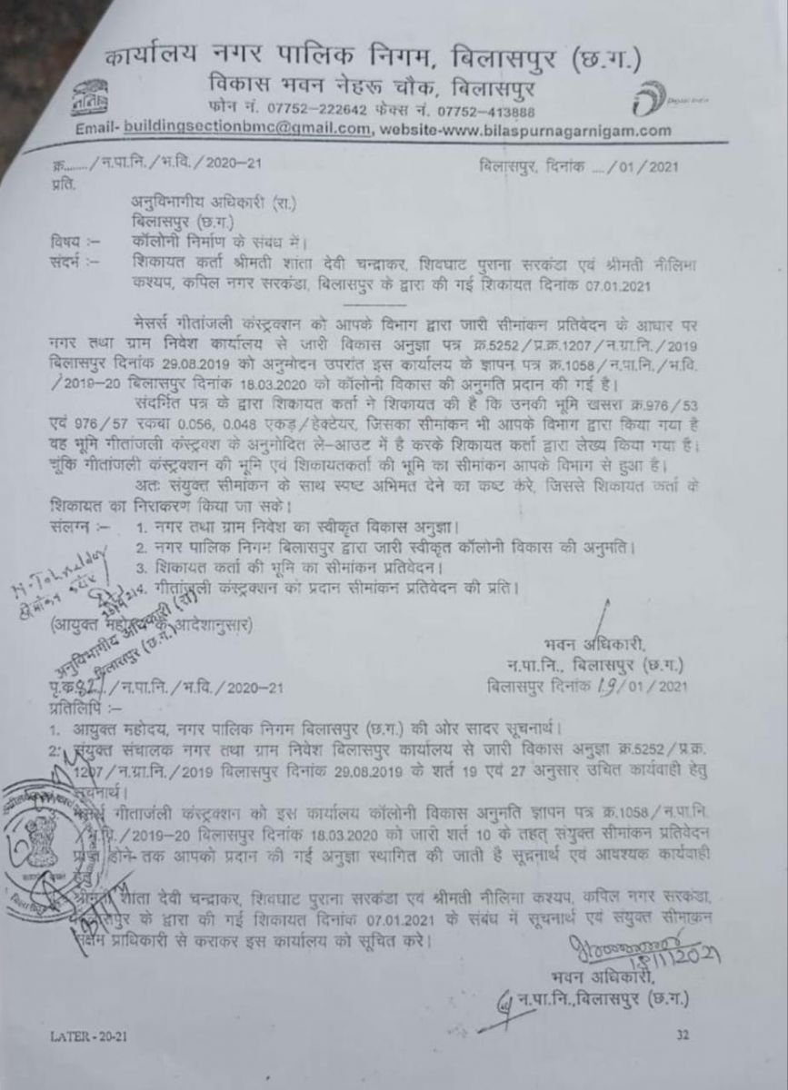 बिलासपुर। गीतांजलि कंस्ट्रक्शन की स्वर्णिमा एरा कॉलोनी के भीतर खसरा क्रमांक 976/53, 976/57 के सीमांकन से उपजे विवाद में नगर पालिक निगम बिलासपुर की के भवन अधिकारी की भूमिका अपने आप में संदिग्ध है। उन्होंने 18 . 1. 2021 को शिकायतकर्ता के आवेदन पत्र के आधार पर गीतांजलि कंस्ट्रक्शन की विकास अनुज्ञा स्थगित कर दी। पत्र में कहा कि टीम बनाकर भूमि का सीमांकन कराएं प्रतिवेदन उपलब्ध कराएं इसके बाद कॉलोनाइजर गीतांजलि कंस्ट्रक्शन जब कभी भी उपस्थित हुआ हो 25. 1 को इसी भवन अधिकारी ने अपने 18.1 के आदेश को स्थगित कर लिया आश्चर्य की बात है कि भवन अधिकारी ही विकास अनुज्ञा जारी करता है। भवन अधिकारी ही अपनी विकास अनुज्ञा को स्थगित करता है। फिर अपने ही स्थगन आदेश को स्थगित कर लेता है ।