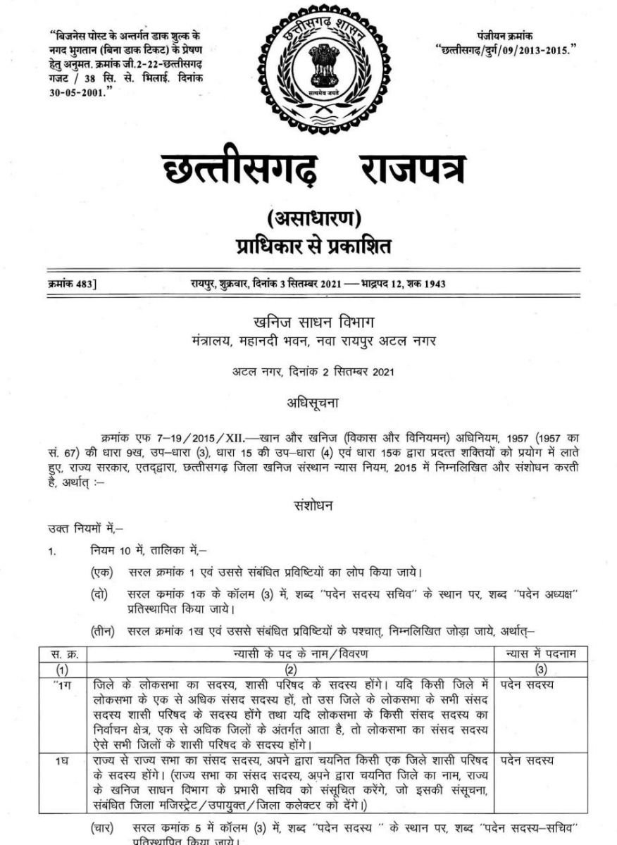 रायपुर 6 अगस्त 21। छत्तीसगढ़ में कलेक्टर ही DMF परिषद के अध्यक्ष होंगे। केंद्र के पत्र के बाद DMF परिषद में संशोधन राजपत्र में प्रकाशित हो गया है। इससे पहले राज्य सरकार ने प्रभारी मंत्रियों को DMF परिषद का अध्यक्ष बनाया था। इस आदेश को लेकर पिछले महीने 18 अगस्त को राज्य को केंद्र ने पत्र लिखकर कहा था कि प्रभारी मंत्रियों को DMF परिषद के अध्यक्ष पद से हटायें, क्योंकि फंड के प्रमुख कलेक्टर ही होंगे। प्रह्लाद जोशी के पत्र में इस मामले में तत्काल क्रियान्वयन के लिए भी कहा गया था। इस पत्र के बाद अब राज्य सरकार ने परिषद को लेकर संशोधन को राजपत्र में प्रकाशित कर दिया है ।