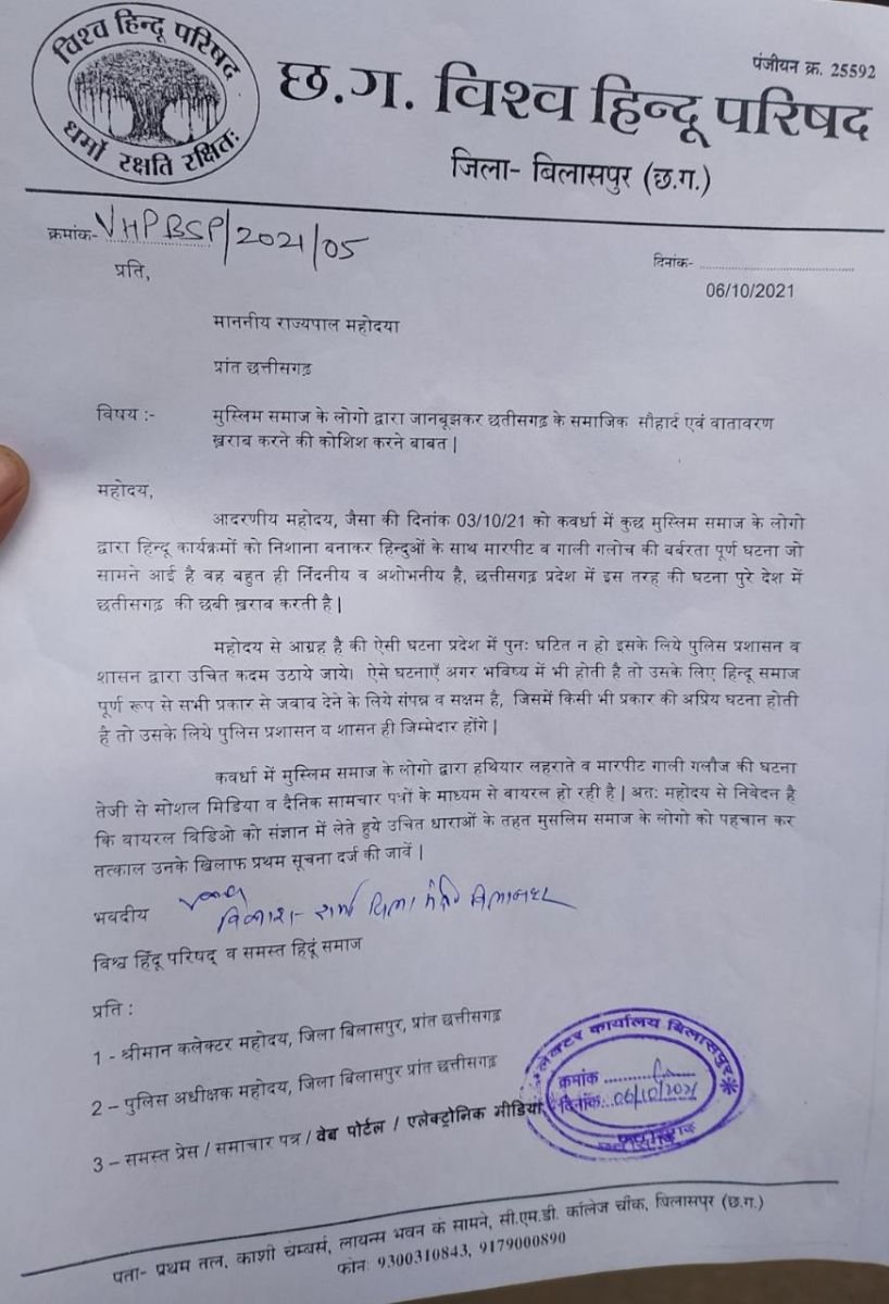 बिलासपुर । आज दिनांक 6/10/21 को विश्व हिंदू परिषद, बजरंग दल बिलासपुर द्वारा राज्यपाल एवं कलेक्टर को कवर्धा में हुई घटना के विरोध में ज्ञापन सौंपा और प्रशासन द्वारा हिंदुओं पर की गई कठोर कार्यवाही की निंदा करते हुए चेतावनी दी गई कि जल्द से जल्द न्यायिक जांच करवा कर विधर्मियों के विरुद्ध कठोर से कठोर कार्रवाई करवाएं अन्यथा विश्व हिंदू परिषद, बजरंग दल अपने धर्म की रक्षा के लिए सक्षम है उसे उकसाया ना जाए अन्यथा उग्र आंदोलन होगा जिसकी समस्त जवाबदारी प्रशासन की होगी।