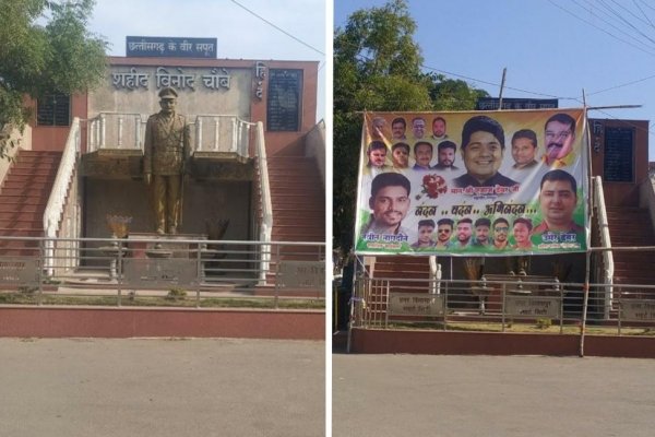 समाचार प्रकाशन होने के बाद शहीद की प्रतिमा से हटा पोस्टर बैनर