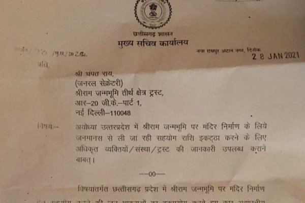 छग शासन के चीफ सेक्रेटरी ने श्रीराम जन्म भूमि तीर्थ क्षेत्र ट्रस्ट के जनरल सेक्रेटरी को लिखा पत्र,मांगा मंदिर निर्माण के लिए सहयोग राशि एकत्र करने वाले अधिकृत व्यक्ति/ट्रस्ट/संस्था की सूची