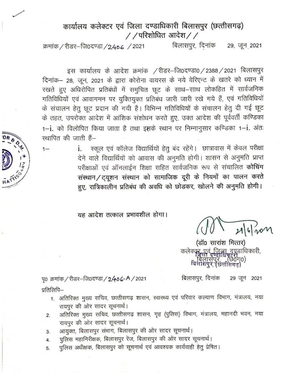 बिलासपुर । कोरोना वायरस के नये वेरिएन्ट के खतरे को ध्यान में रखते हुए अधिरोपित प्रतिबंधों में समुचित छूट के साथ-साथ लोकहित में सार्वजनिक गतिविधियों एवं आवागमन पर युक्तियुक्त प्रतिबंध जारी रखे गये हैं, एवं गतिविधियों के संचालन हेतु छूट प्रदान की गयी है। विभिन्न गतिविधियों के संचालन हेतु दी गई छूट के आदेश में आंशिक संशोधन किया गया है। कलेक्टर द्वारा जारी आदेशनुसार