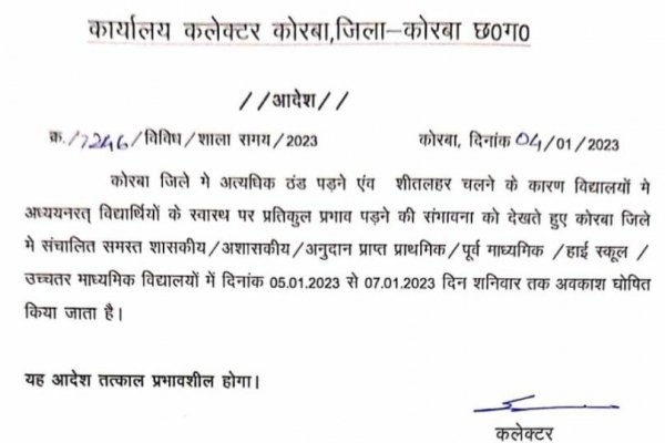 कोरबा, 4 जनवरी 2022। कलेक्टर संजीव झा ने जिले के वर्तमान मौसम एवं शीतलहर की स्थिति को देखते हुए स्कूली बच्चों की सुरक्षा के लिए महत्वपूर्ण फैसला लिया है। कलेक्टर ने जिले में संचालित सभी शासकीय-अशासकीय, अनुदान प्राप्त प्राथमिक, पूर्व माध्यमिक, हाई स्कूल एवं हायर सेकेण्डरी स्कूलों में 5 से 7 जनवरी तक अवकाश घोषित किया है। इस संबंध में जरूरी आदेश भी जारी कर दिए गए हैं। कलेक्टर ने जिले में अत्यधिक ठण्ड बढ़ने एवं शीतलहर चलने के कारण विद्यालयों में अध्ययनरत् बच्चों के स्वास्थ्य पर प्रतिकूल प्रभाव पड़ने की संभावना को देखते हुए सभी स्कूलों में अवकाश घोषित किया है।