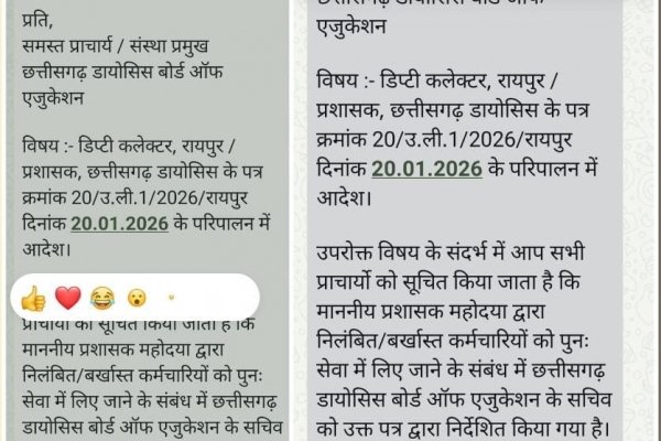 छत्तीसगढ़ डायोसिस बोर्ड ऑफ़ एजूकेशन पंजीकृत के लेटर को पढ़ने से ऐसा लगता है कि रायपुर एसडीएम को जो काम कलेक्टर रायपुर ने सोप था समय सीमा में समिति चुनाव से हटकर हुए कर्मचारियों के मुद्दे पर उलझ गई है। चुनाव कराने की समय सीमा तो 30 दिसंबर को समाप्त हो गई है। सीडीबीई पंजीकृत की अंतिम वैध सचिव शशि लता वाघे ने छत्तीसगढ़ में समिति द्वारा संचालित सभी 19 स्कूलों के प्राचार्य को एक पत्र लिखा है और कहा है कि माननीय प्रशासक महोदय द्वारा निलंबित/बर्खास्त कर्मचारियों को पूर्ण सेवा के लिए जाने के संबंध में जो पत्र मिला है उसमें स्पष्ट आदेश और बहाली नियमों का पालन नहीं हुआ है।